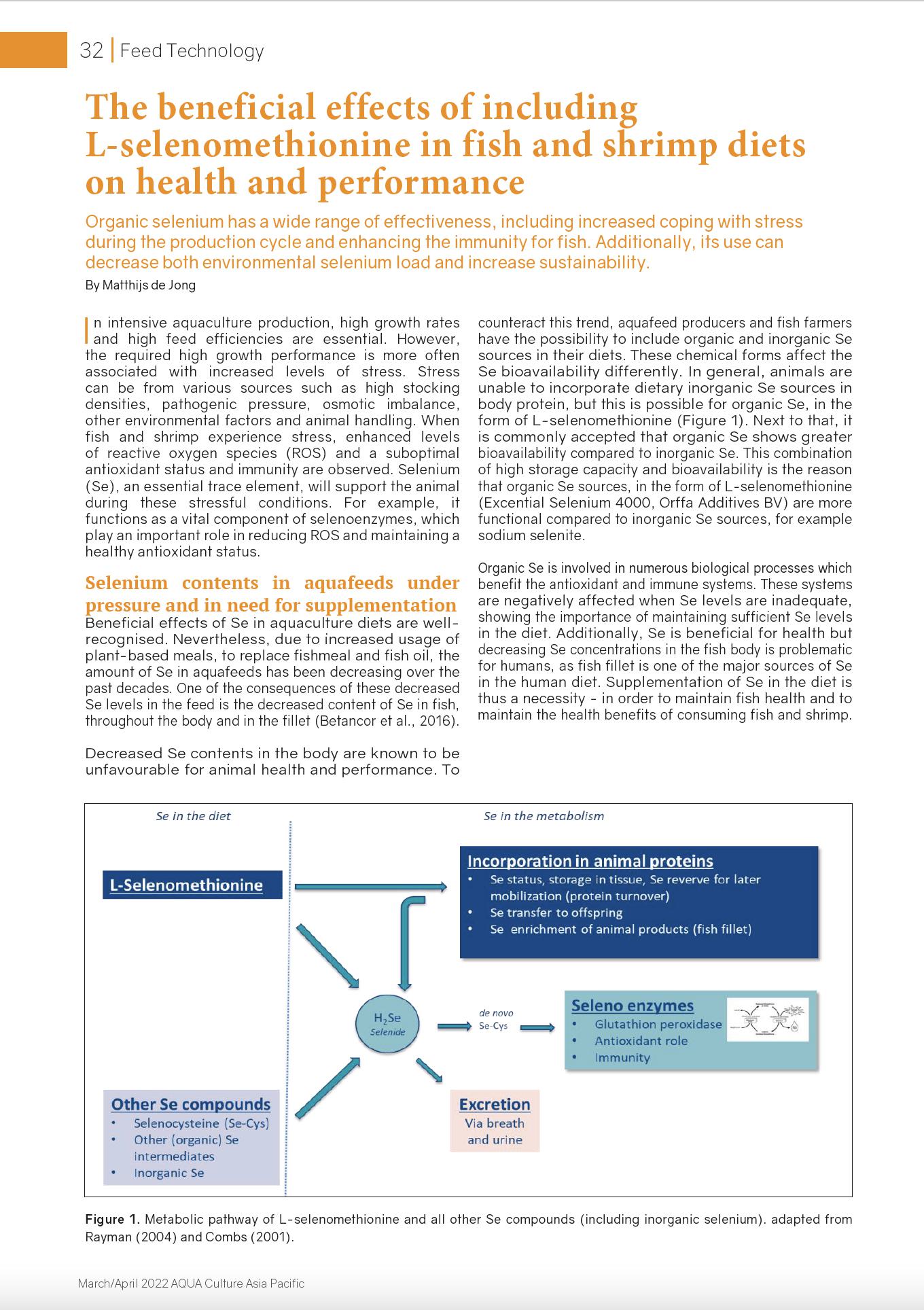 Organic selenium has a wide range of effectiveness, including increased coping with stress during the production cycle and enhancing the immunity for fish. Additionally, its use can decrease both environmental selenium load and increase sustainability.17239826-48f3-451a-9339-7f1389a1d014, 96b0fedb-74b2-4bf5-87ea-3759b48f4217 11174f0e-2503-4011-83f9-3d4c7ff91e3d 677dbd38-0773-44d8-aa65-d2106819dd4e11174f0e-2503-4011-83f9-3d4c7ff91e3d202203152022 -