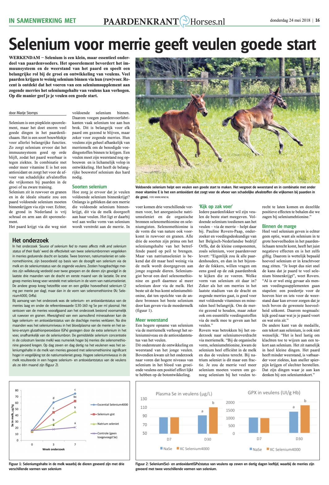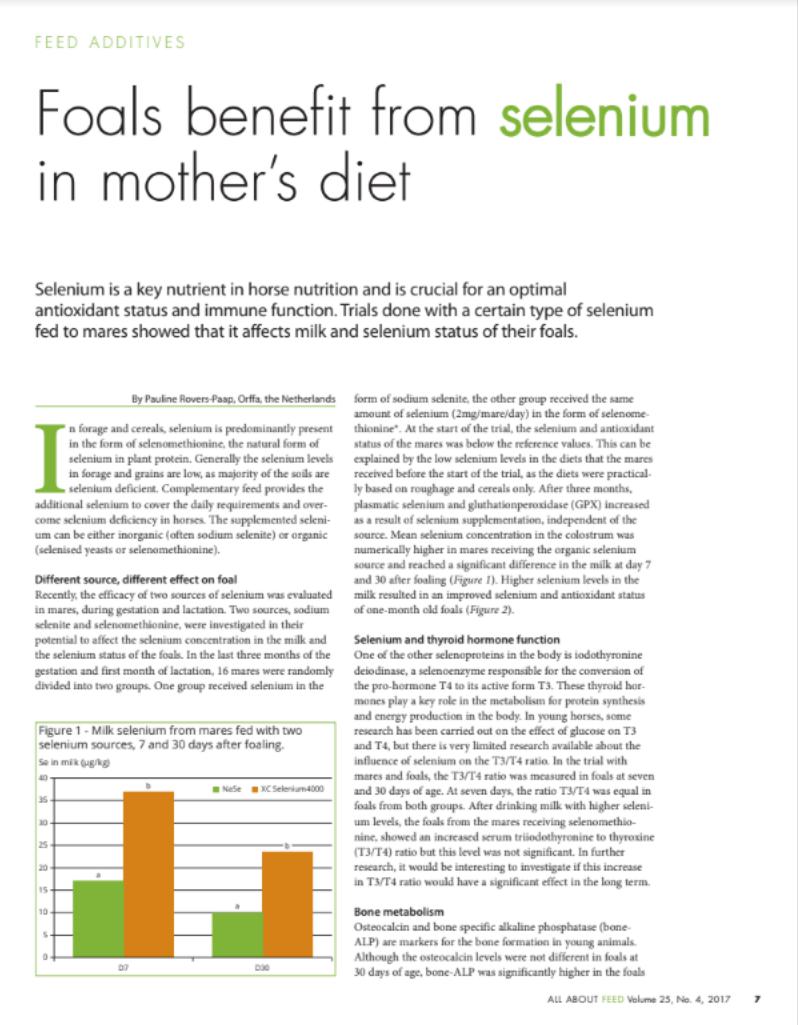 Selenium is a key nutrient in horse nutrition and is crucial for an optimal antioxidant status and immune function. Trials done with a certain type of selenium fed to mares showed that it affects milk and selenium status of their foals.17239826-48f3-451a-9339-7f1389a1d014, 726155a2-e68c-47a8-a221-7a7ff83773e5 11174f0e-2503-4011-83f9-3d4c7ff91e3d 677dbd38-0773-44d8-aa65-d2106819dd4e11174f0e-2503-4011-83f9-3d4c7ff91e3d201705012017 -