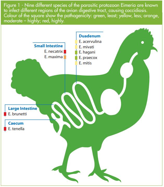 Coccidiosis in poultry is caused by a parasitic protozoan Eimeria. The main concern from coccidiosis is that disease is not related to a single Eimeria spp. Infections result from a mixture of Eimeria species that invade different parts of the intestine, as shown in Figure 1. The intracellular parasite invades and destroys the epithelial cells of the host, causing severe damage to the intestinal wall. Nine different Eimeria species are known in poultry, only five to seven of which are associated with diseases in commercial flocks.