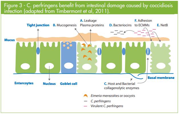 In the initial stage of necrotic enteritis, collagenolytic enzymes affect the extracellular matrix and cellular junctions. Both host collagenases (probably stimulated by coccidial infection) and bacterial collagenolytic enzymes may play a role in the disorganisation or even complete destruction of the cellular matrix and the tight junctions between epithelial cells (C). Production of bacteriocins by a virulent strain inhibits the growth of other C. perfringens strains in the gut. This has the maximum benefit of increased nutrient availability released by the coccidiosis infection (D)12.
