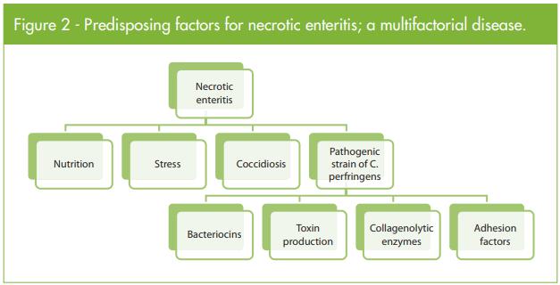 Clostridium perfringens is commonly found in the normal healthy avian gut microbiota. The virulence of a strain depends on its nature. Strains of C. perfringens are classified into five different types (A to E) on the basis of the production of four major toxins. Clostridium type A is associated with necrotic enteritis in broilers, although this type is also found in the digestive tract of healthy poultry9 . As necrotic enteritis is a multifactorial disease, more predisposing factors are needed for its development (Figure 2)10. High levels of (animal) protein or poorly digestible protein sources are associated with a higher risk of necrotic enteritis, as undigested protein is a growth substrate for pathogenic bacteria such as C. perfringens. Wheat, rye, oats and barley are more often associated with necrotic enteritis, due to higher levels of indigestible, water soluble, non-starch polysaccharides, whereas maize is not. Besides the choice of raw materials, particle size also seems to influence gut health. Feed containing many small and some largesized particles is more predisposed to necrotic enteritis than feed containing uniform particles7,10,15. Changes in the feeding regime (moving from starter to grower diets), other diseases and increased stocking density increase stress in the flock and suppress the immunological status of the chickens, making them more sensitive to necrotic enteritis infection12.