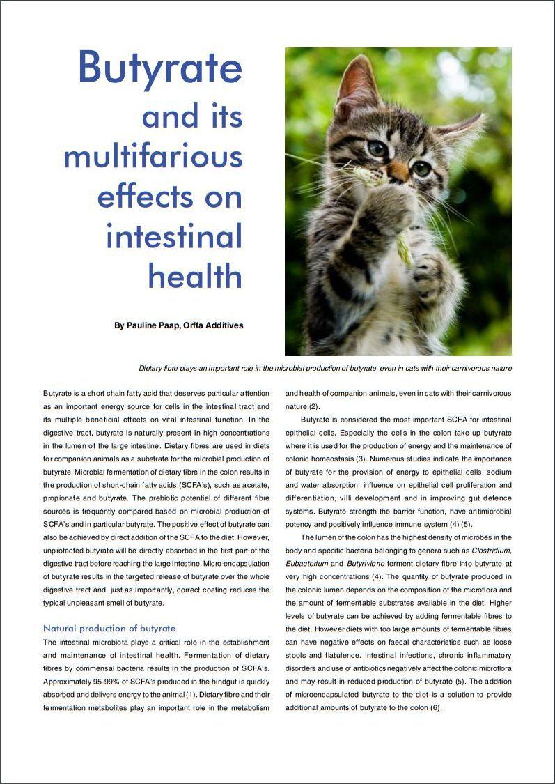 Butyrate is a short chain fatty acid that deserves particular attention as an important energy source for cells in the intestinal tract and its multiple beneficial effects on vital intestinal function. In the digestive tract, butyrate is naturally present in high concentrations in the lumen of the large intestine.0e1d35c8-dda2-46c9-8fa1-b738e8fe1649, c38f462e-3e5d-4b86-88f4-16cd48c1a5c0 af393e79-b464-4d5d-8120-a76ce682e7fa 677dbd38-0773-44d8-aa65-d2106819dd4eaf393e79-b464-4d5d-8120-a76ce682e7fa201401012014 -
