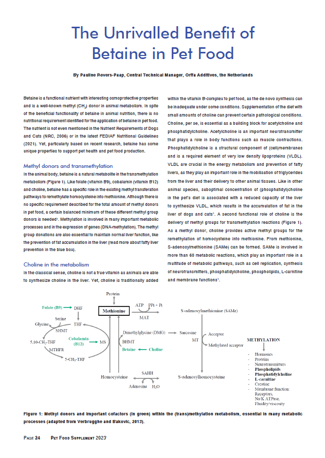 Betaine is a functional nutrient with interesting osmoprotective properties and is a well-known methyl (CH3) donor in animal metabolism. In spite of the beneficial functionality of betaine in animal nutrition, there is no nutritional requirement identified for the application of betaine in pet food.75668571-875d-4f33-ae60-582bef77df3b, c38f462e-3e5d-4b86-88f4-16cd48c1a5c0 b1593db0-31fe-429f-8cd8-ac5a04ed6642 677dbd38-0773-44d8-aa65-d2106819dd4eb1593db0-31fe-429f-8cd8-ac5a04ed6642202305232023 -