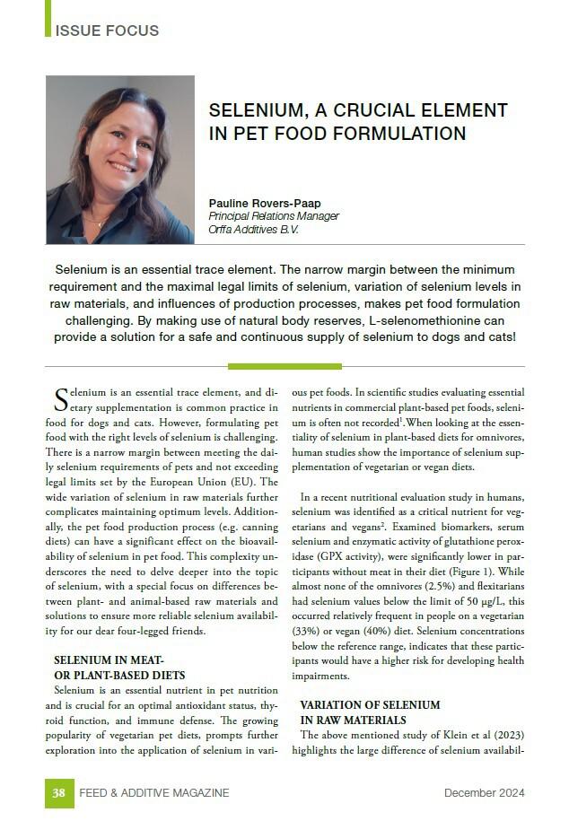Selenium is an essential trace element. The narrow margin between the minimum requirement and the maximal legal limits of selenium, variation of selenium levels in raw materials, and influences of production processes, makes pet food formulation challenging.17239826-48f3-451a-9339-7f1389a1d014, c38f462e-3e5d-4b86-88f4-16cd48c1a5c0 11174f0e-2503-4011-83f9-3d4c7ff91e3d 677dbd38-0773-44d8-aa65-d2106819dd4e11174f0e-2503-4011-83f9-3d4c7ff91e3d202412062024 -
