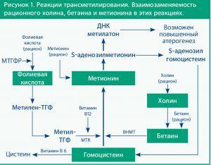 Бетаин всасывается в желудочно-кишечном тракте (ЖКТ), в то время как до 3/4 бетаина остаётся на внутриклеточном уровне ЖКТ. Внутриклеточное накопление происходит через активные (Na+ или Cl-) и пассивные (Na+) транспортные системы. Бетаин выводится путем метаболизма, а не экскреции, и катаболизируется в ряде ферментативных реакций (трансметилирования), которые происходят в митохондриях клеток печени и почек. Основная физиологическая роль бетаина – действовать как осмолит и донор метила (трансметилирование). В качестве осмолита (характеристики диполярного цвиттер-иона) бетаин повышает удержание внутриклеточной воды и, следовательно, защищает внутриклеточные ферменты от инактивации под действием осмоса. В качестве донора метильной группы бетаин участвует в метиониновом цикле (в основном в печени) и может в дальнейшем использоваться в реакциях трансметилирования для синтеза таких основных веществ, как карнитин и креатин (рис. 1).