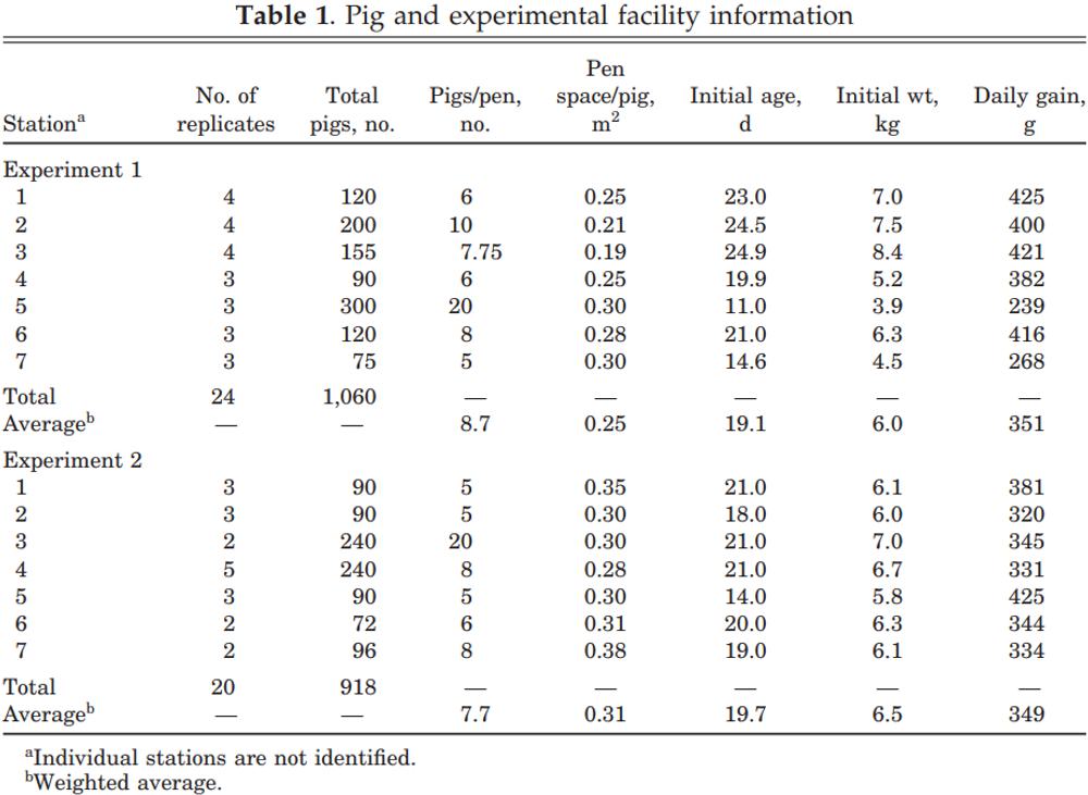 The first experiment evaluated the efficacy of five dietary concentrations of supplemental ZnO fed to postweaning pigs in a randomized complete block design. The concentrations evaluated were 0, 500, 1,000, 2,000, and 3,000 mg Zn/kg using a common source of ZnO that contained 72% Zn (Prince Agri Products, Quincy, IL). Seven university research stations (IA, MI, MN, MO, NE, ND, and OH) participated in the experiment for a total of 24 replicates (each contributed a minimum of two replicates). The experiment included 1,060 crossbred pigs of various genetic crosses that were weaned at an average age of 19.1 d (range 11 to 25 d) and an average BW of 6.0 kg (range 3.9 to 8.4 kg). Upon weaning, pigs were allotted to treatment pens on the basis of weight, sex, and litter using an equal number of pigs per pen within each replicate. Each station differed in its facility, management, and laboratory methodology, but the procedures followed within each replicate were identical. Pigs were housed in nursery facilities that contained either slotted concrete or plasticcovered wire, mesh-floored pens, with room temperatures adjusted when needed to meet the comfort zone of the pig. Pig information and other experimental conditions for the seven stations that conducted the experiment are presented in Table 1.