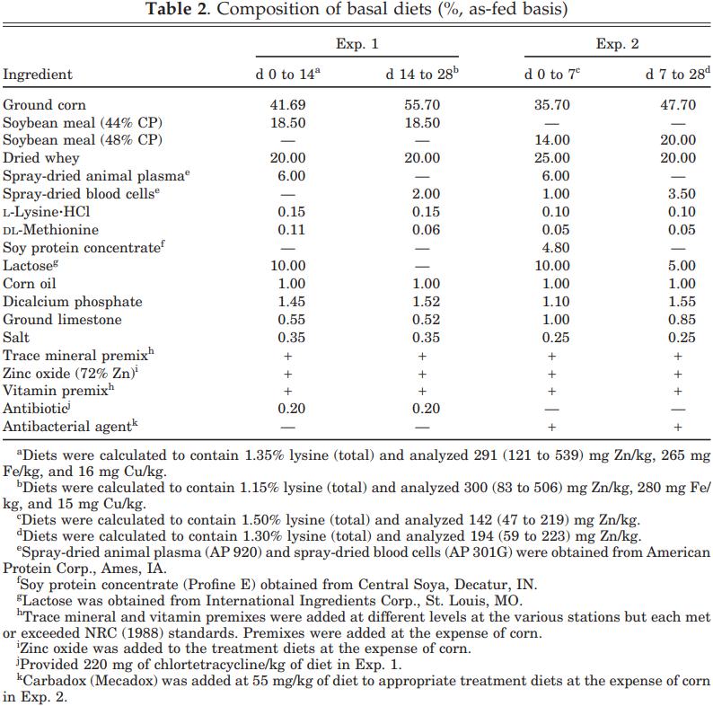 Postweaning diets contained both animal and vegetable protein sources and were formulated to provide a dietary lysine concentration of 1.35% (total) for the initial 14-d postweaning period and 1.15% (total) lysine for the 14- to 28-d postweaning period. Vitamin and trace mineral premix compositions differed among stations but each premix met or exceeded NRC (1988) requirements. Each station added the antibiotic chlortetracycline at 220 mg/kg to the nursery diets. Supplemental ZnO was added to treatment diets at the appropriate concentration at the expense of corn. The composition of the basal diets is presented in Table 2. Diets were subsampled at mixing and subsequently analyzed for Zn, Fe, and Cu. The analyzed basal diets averaged 291 and 300 mg Zn/kg, 265 and 280 mg Fe/kg, and 16 and 15 mg Cu/kg for the two production phases, respectively.