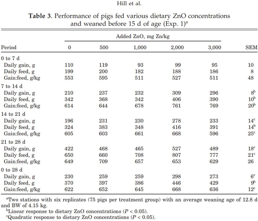 Our experiment evaluated the efficacy of dietary ZnO at nine different university research stations using a total of 1,978 pigs that involved various genotypes, facilities, management conditions, and weaning ages. The results clearly demonstrated a growth response to added ZnO that reached a plateau at dietary concentrations of 1,500 to 2,000 mg Zn/kg.