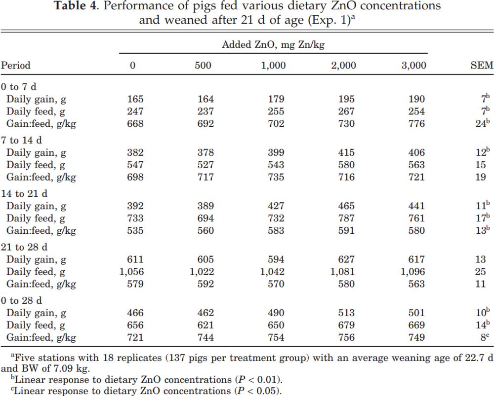 Adding ZnO to nursery pig diets resulted in increased pig performance responses that reached a plateau at dietary concentrations of 1,500 to 2,000 mg Zn/kg. The performance responses to ZnO and the antibacterial agent carbadox were additive. Earlier-weaned pigs may benefit more from high dietary ZnO concentrations, but a positive growth and feed response also occurred in later-weaned pigs.