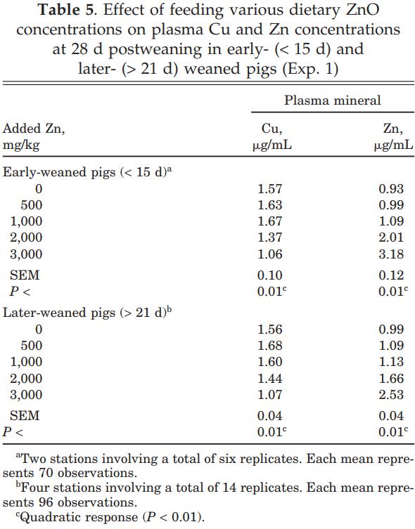 Our results therefore suggest no benefit when supplementing nursery pig diets with ZnO at dietary concentrations in excess of 1,500 to 2,000 mg Zn/kg. Because many commercial feed companies are incorporating higher dietary concentrations of Zn that could disturb the body’s homeostasis of these or other elements, this continued practice is questionable. With the low bioavailability of Zn from ZnO much of the Zn is excreted in the feces. Consequently, lower dietary concentrations of ZnO (1,500 to 2,000 mg Zn/kg) when fed for relatively short periods (≤ 28 d) would seem to pose fewer environmental concerns than the current practice of supplementing higher concentrations of the mineral. #