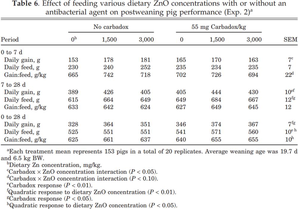 Feed intake from 0 to 7 d postweaning was not affected by carbadox or by ZnO concentration (P > 0.15). For the 7- to 28-d period, feed intake increased when carbadox was added to the diet (P < 0.05) with a quadratic increase (P < 0.01) in feed intake as the ZnO concentration increased. For the overall 28-d period daily gains and feed intakes both increased (P < 0.01) when carbadox was added, with quadratic improvements (P < 0.01, P < 0.05, respectively) for both variables as the ZnO concentration increased. Gain:feed ratios tended (P < 0.10) to improve during the 0- to 7-d period when both ZnO and carbadox were added to the diet but quadratically (P < 0.05) when the ZnO concentration increased. For the 0- to 28-d period, these measurements seemed to reach a plateau at the 1,500 mg Zn/ kg concentration, and the responses were generally consistent with those of Exp. 1.