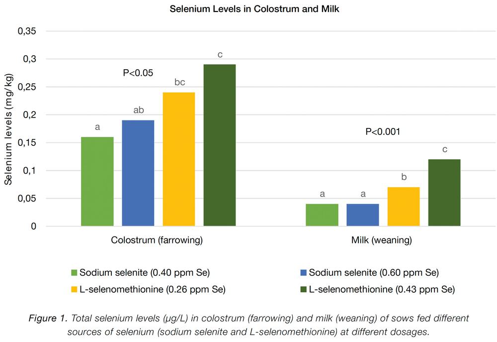 The L-selenomethionine used in this study was Excential Selenium 4000 from Orffa Additives B.V. When evaluating the results, it was shown that the levels in colostrum and milk for total selenium (Figure 1), selenoP (SelP), selenoalbumin (SeAlb) and selenomethionine (SeMet) were significantly higher (P<0.05) for the L-selenomethionine supplemented sows. The higher levels of inorganic sodium selenite did not increase the selenium transfer into milk.
