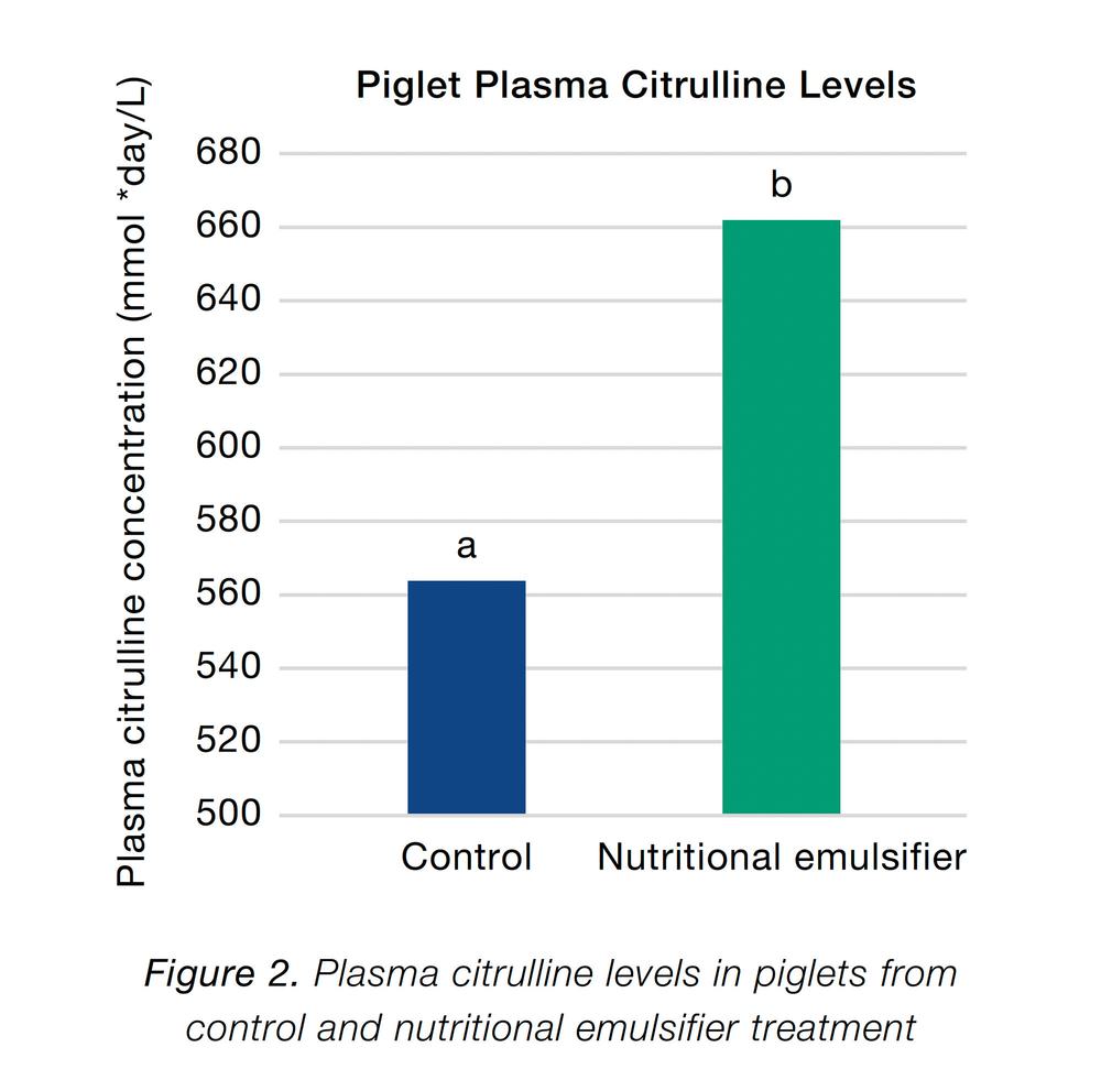The results showed an effect on citrulline levels, which functions as marker for metabolic activity and functional mass of the enterocytes. The inclusion of nutritional emulsifier in the piglet diet significantly increased (P<0.05) citrulline levels, regardless of the diet fed to the sows (Figure 2). This indicates that the emulsifier can improve the metabolism in piglets after weaning.