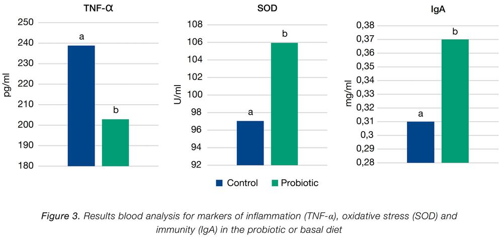 On day 42 of the trial, blood samples were col-lected and analysed for 10 piglets per treatment. This analysis showed significantly higher immunoglobulin A (IgA) levels and superoxide dismutase (SOD) activity, and significantly lower TNF-α lev-els (P<0.05) for the probiotic supplemented group (Figure 3). Improved IgA levels indicate a better immune response, since IgA functions as antibody involved in the protection of mucous membranes. The higher SOD activity indicated an improved antioxidant status since SOD is an enzyme involved in catalysing the conversion of oxygen radicals into non-radical species. TNF-α is a pro-inflammatory cytokine and lower levels indicate reduced inflammation and inflammationinduced damage.