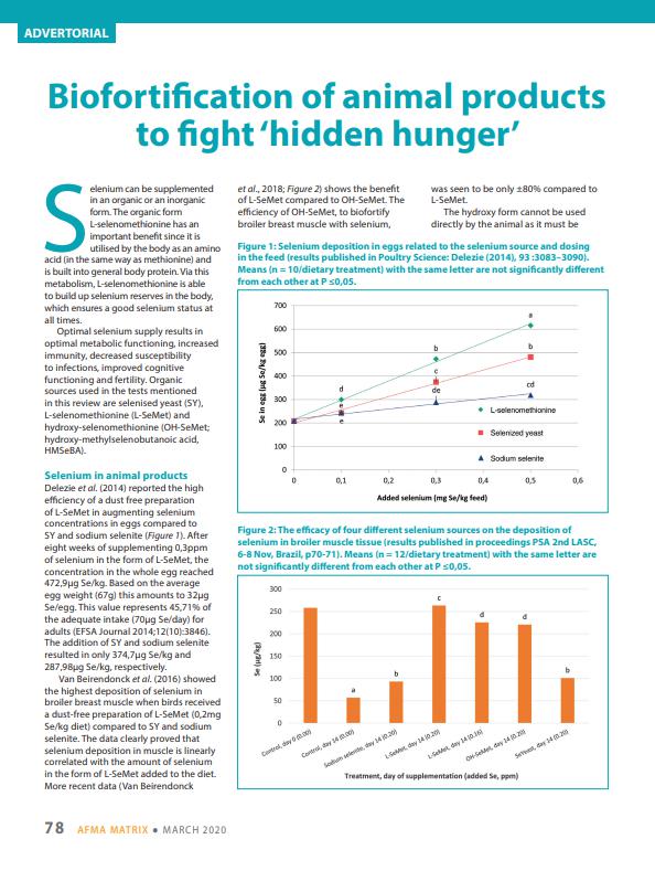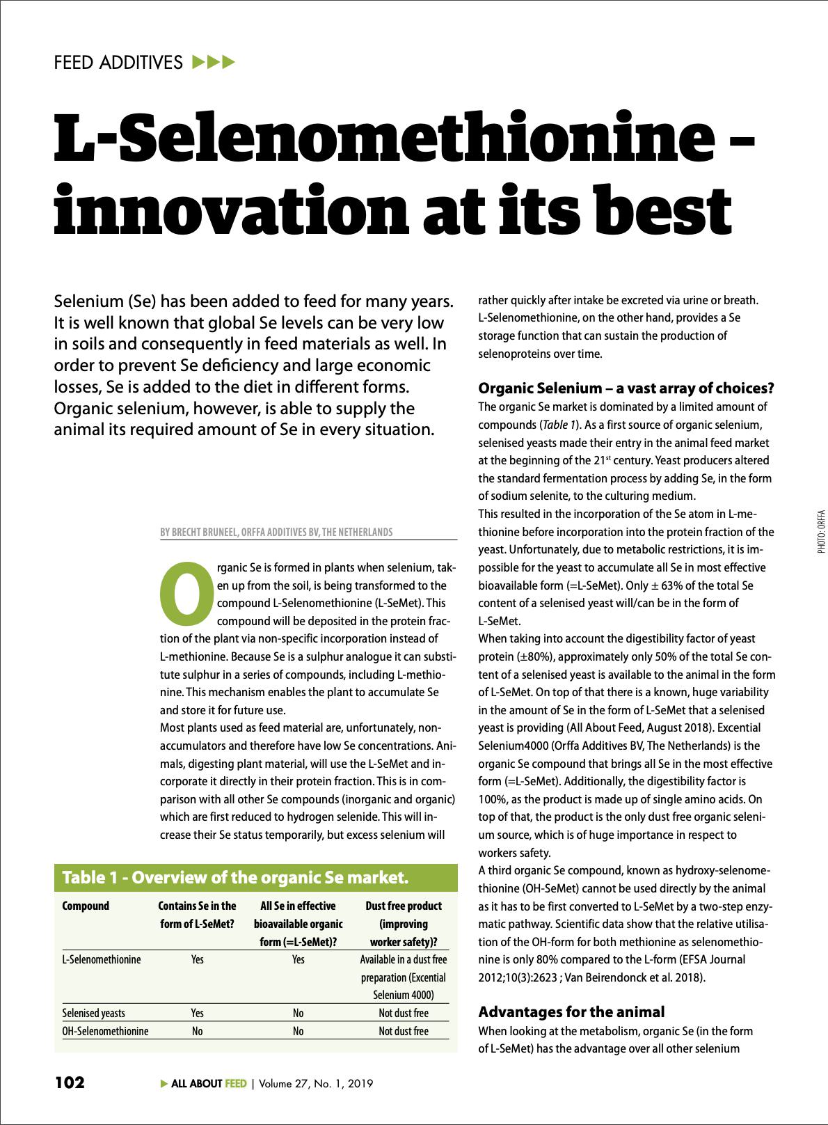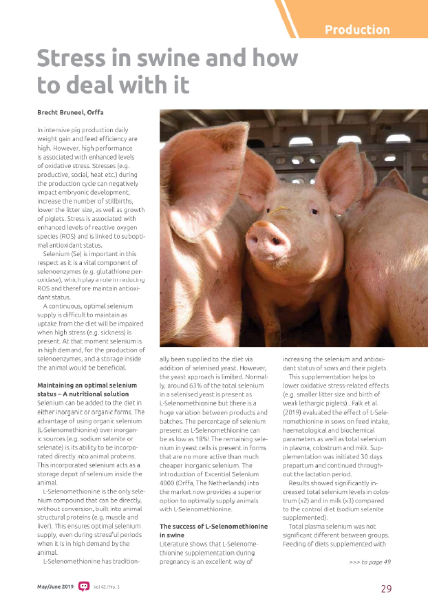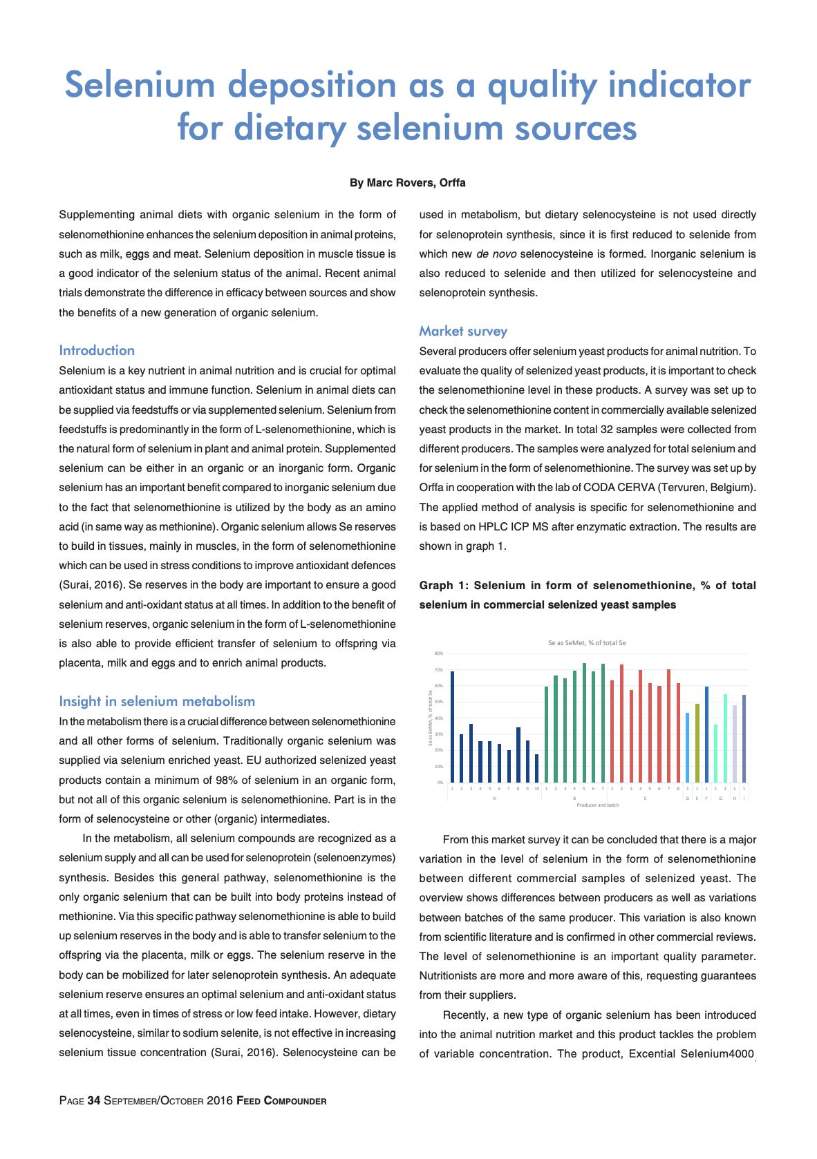 Selenium (Se) has been added to feed for many years. It is well known that global Se levels can be very low in soils and consequently in feed materials as well. In order to prevent Se deficiency and large economic losses, Se is added to the diet in different forms.17239826-48f3-451a-9339-7f1389a1d014, e110f00c-e8de-473c-9311-14c7516c6d0a,6a8415ac-c669-4253-a1a7-ba3d5d7872f1,96b0fedb-74b2-4bf5-87ea-3759b48f4217,0488eb96-b937-4f4b-af7d-6736cd38203f,c38f462e-3e5d-4b86-88f4-16cd48c1a5c0,726155a2-e68c-47a8-a221-7a7ff83773e5 11174f0e-2503-4011-83f9-3d4c7ff91e3d 677dbd38-0773-44d8-aa65-d2106819dd4e11174f0e-2503-4011-83f9-3d4c7ff91e3d201902012019 -