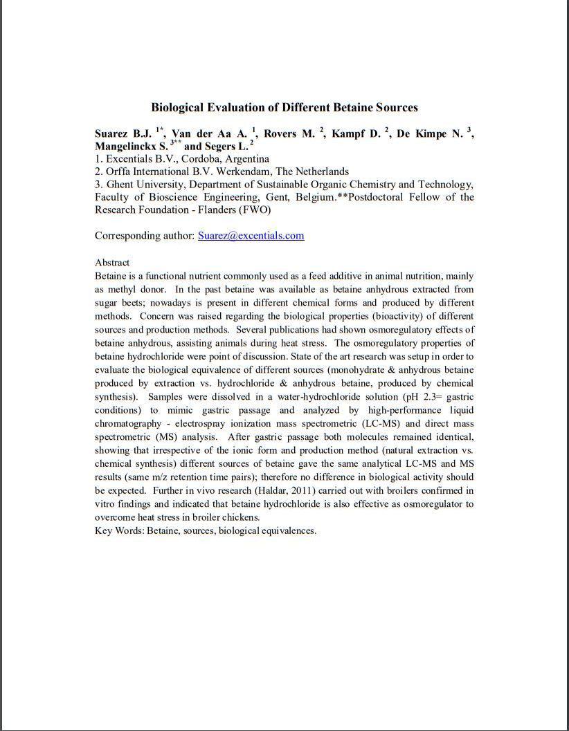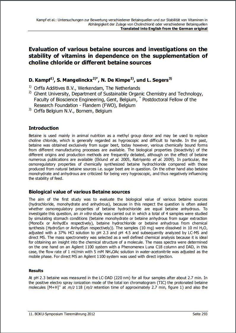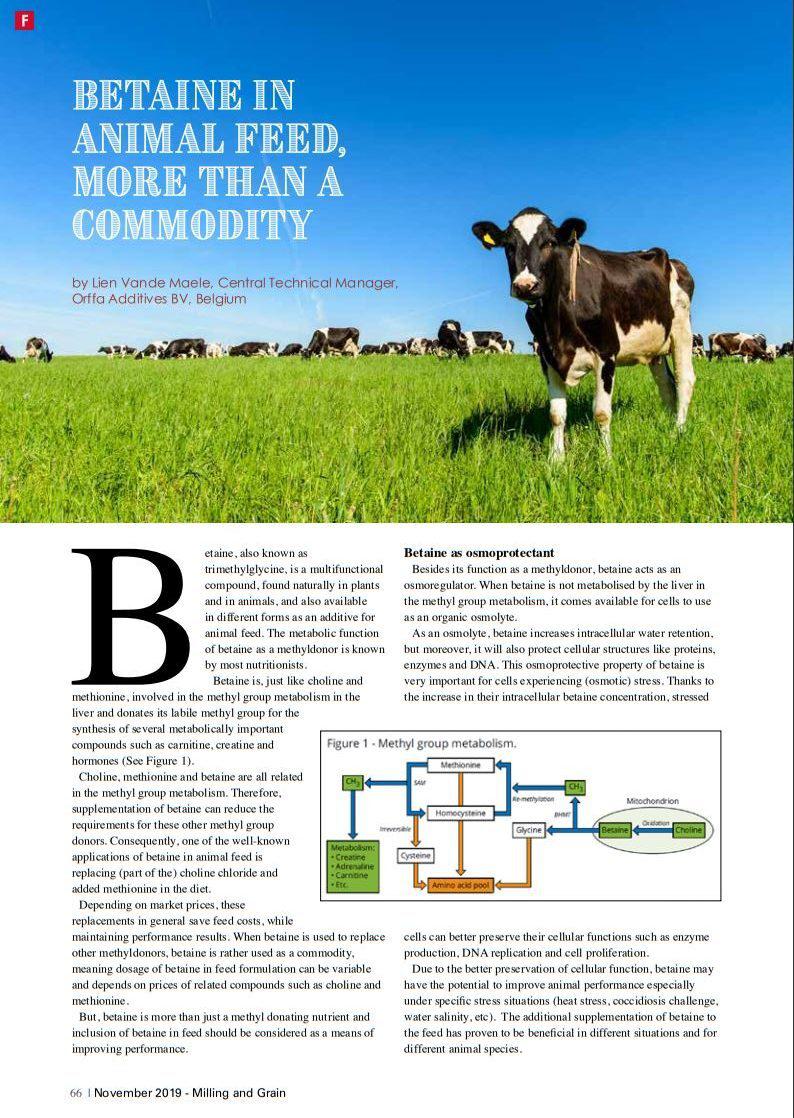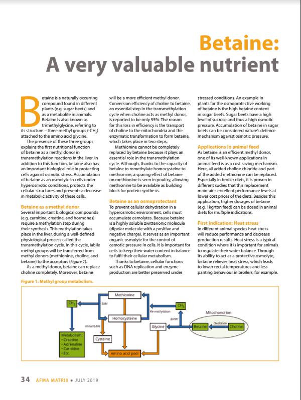 Betaine is a functional nutrient commonly used as a feed additive in animal nutrition, mainly as methyl donor. In the past betaine was available as betaine anhydrous extracted from sugar beets; nowadays is present in different chemical forms and produced by different methods.75668571-875d-4f33-ae60-582bef77df3b, e110f00c-e8de-473c-9311-14c7516c6d0a,6a8415ac-c669-4253-a1a7-ba3d5d7872f1,96b0fedb-74b2-4bf5-87ea-3759b48f4217,0488eb96-b937-4f4b-af7d-6736cd38203f,c38f462e-3e5d-4b86-88f4-16cd48c1a5c0,726155a2-e68c-47a8-a221-7a7ff83773e5 b1593db0-31fe-429f-8cd8-ac5a04ed6642 677dbd38-0773-44d8-aa65-d2106819dd4eb1593db0-31fe-429f-8cd8-ac5a04ed6642201201012012 -