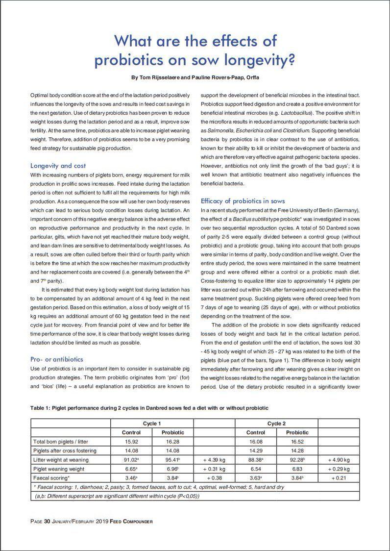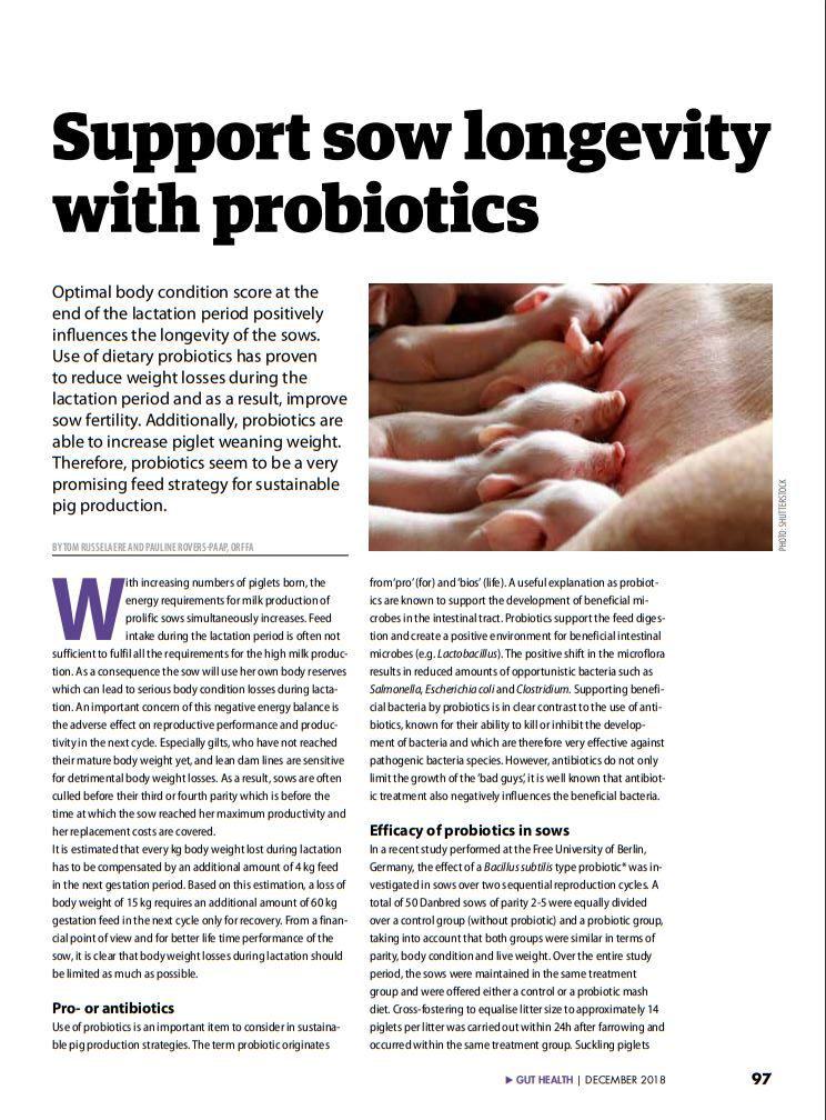 Optimal body condition score at the end of the lactation period positively influences the longevity of the sows. Use of dietary probiotics has proven to reduce weight losses during the lactation period and as a result, improve sow fertility. Additionally, probiotics are able to increase piglet weaning weight. Therefore, probiotics seem to be a very promising feed strategy for sustainable pig production0e1d35c8-dda2-46c9-8fa1-b738e8fe1649, 6a8415ac-c669-4253-a1a7-ba3d5d7872f1 6858c51e-bc53-4662-b2c9-1361d9a69159 677dbd38-0773-44d8-aa65-d2106819dd4e6858c51e-bc53-4662-b2c9-1361d9a69159201812012018 -