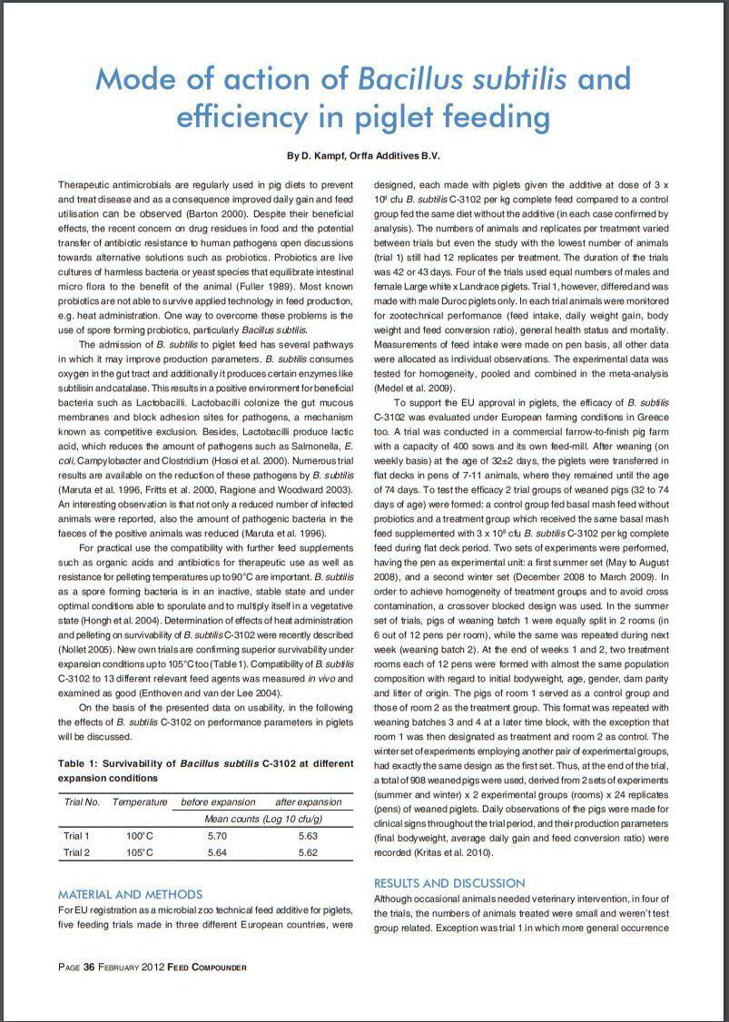 Mode of action of Bacillus subtilis and efficiency in piglet feeding
