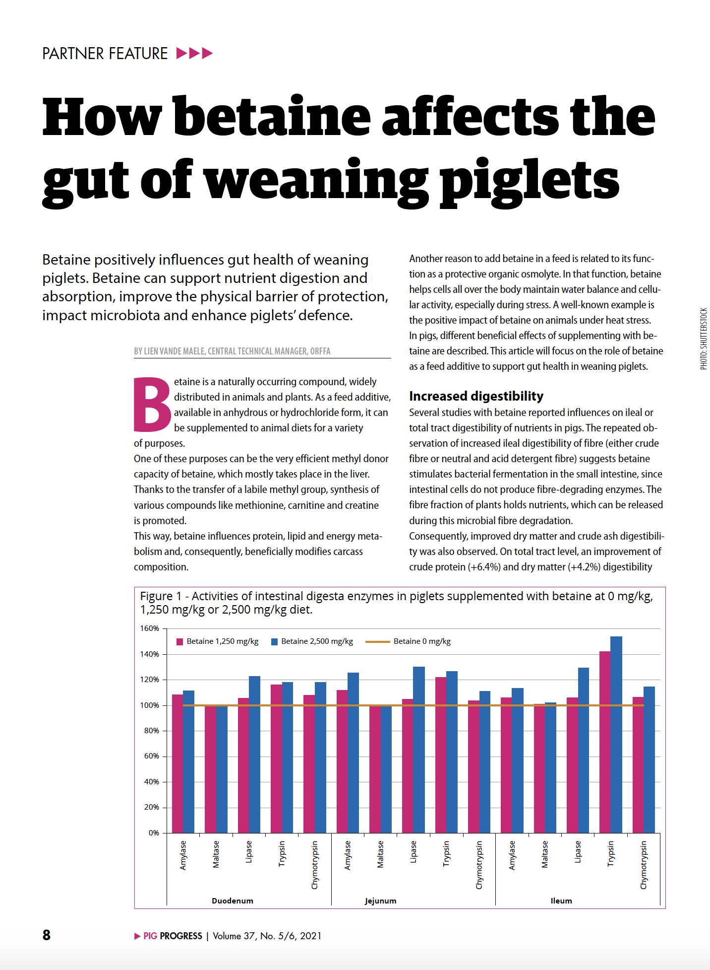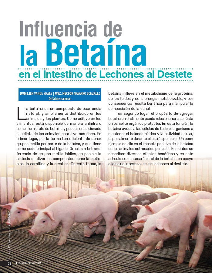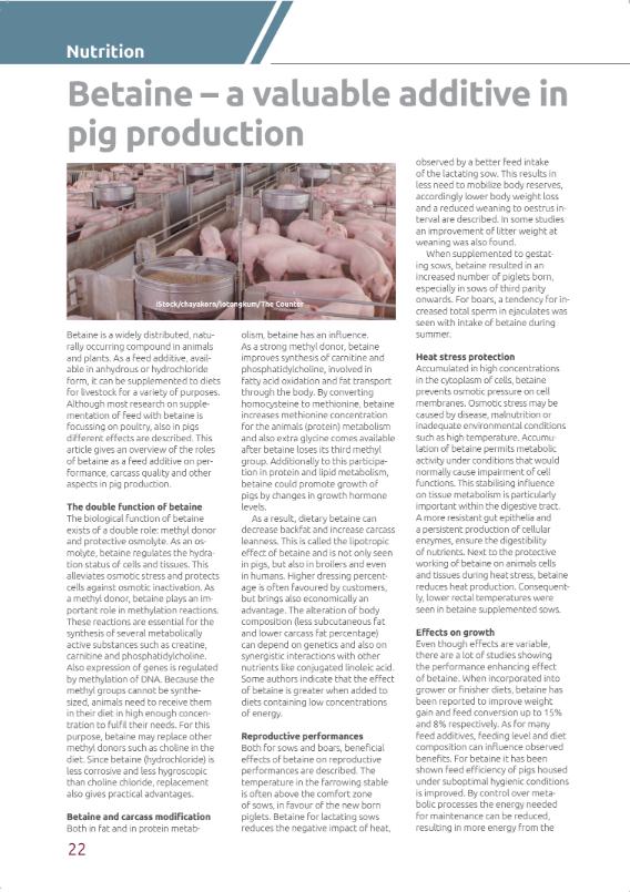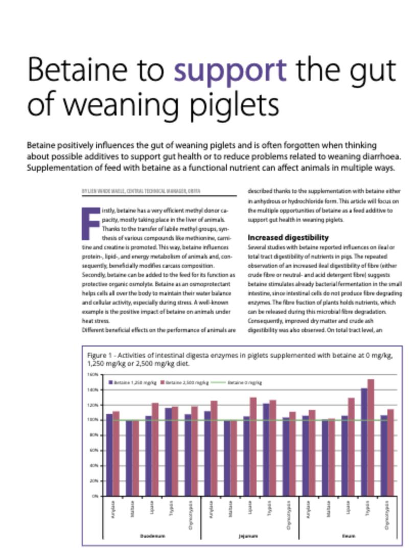 Betaine positively influences the gut of weaning piglets and is often forgotten when thinking about possible additives to support gut health or to reduce problems related to weaning diarrhoea. Supplementation of feed with betaine as a functional nutrient can affect animals in multiple ways.75668571-875d-4f33-ae60-582bef77df3b, 6a8415ac-c669-4253-a1a7-ba3d5d7872f1 b1593db0-31fe-429f-8cd8-ac5a04ed6642 677dbd38-0773-44d8-aa65-d2106819dd4eb1593db0-31fe-429f-8cd8-ac5a04ed6642202206262022 -
