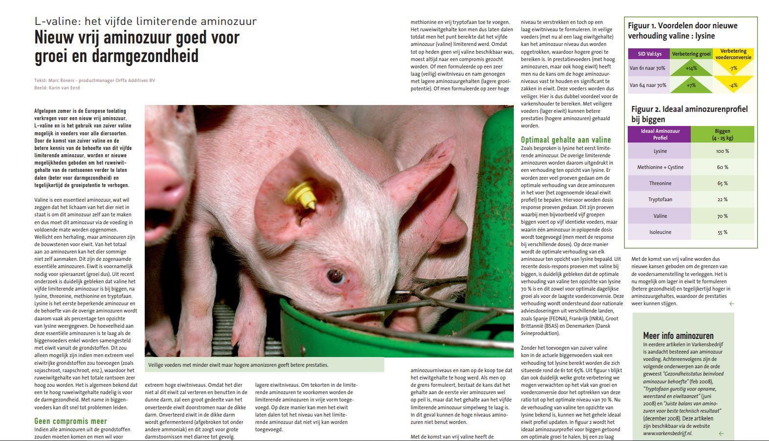 Afgelopen zomer is de Europese toelating verkregen voor een nieuw vrij aminozuur, L-valine en is het gebruik van zuiver valine mogelijk in voeders voor alle diersoorten.75668571-875d-4f33-ae60-582bef77df3b, 6a8415ac-c669-4253-a1a7-ba3d5d7872f1 0dee52e7-9b9b-4a7c-8be8-ac5e68b08e70200910012009 -