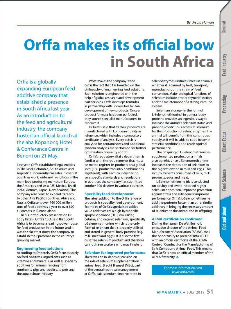 Orffa is a globally expanding European feed additive company that established a presence in South Africa last year.e110f00c-e8de-473c-9311-14c7516c6d0a,6a8415ac-c669-4253-a1a7-ba3d5d7872f1,96b0fedb-74b2-4bf5-87ea-3759b48f4217,0488eb96-b937-4f4b-af7d-6736cd38203f,c38f462e-3e5d-4b86-88f4-16cd48c1a5c0,726155a2-e68c-47a8-a221-7a7ff83773e5 677dbd38-0773-44d8-aa65-d2106819dd4e201907012019 -