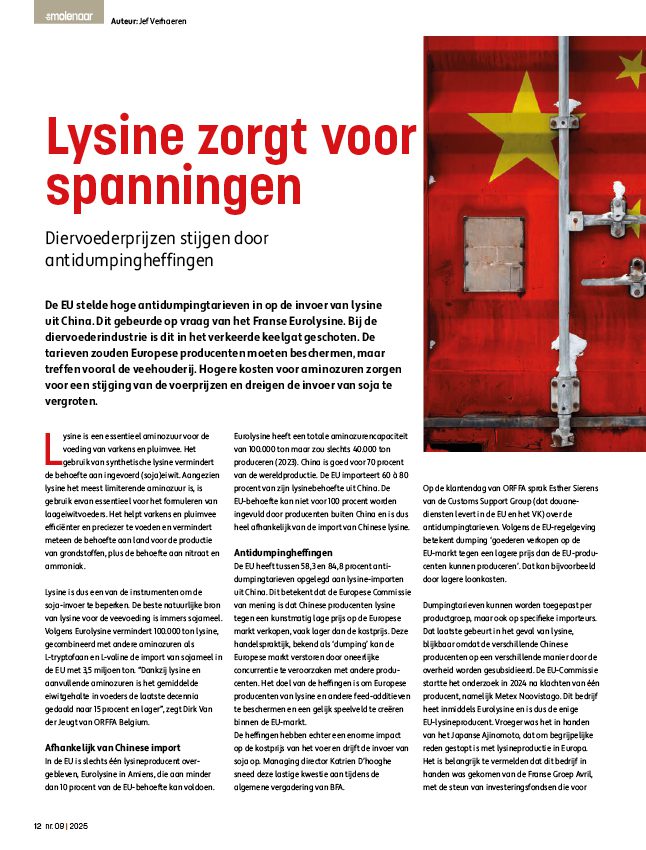 De EU stelde hoge antidumpingtarieven in op de invoer van lysine uit China. Dit gebeurde op vraag van het Franse Eurolysine. Bij de diervoederindustrie is dit in het verkeerde keelgat geschoten.75668571-875d-4f33-ae60-582bef77df3b, e110f00c-e8de-473c-9311-14c7516c6d0a,6a8415ac-c669-4253-a1a7-ba3d5d7872f1,96b0fedb-74b2-4bf5-87ea-3759b48f4217,0488eb96-b937-4f4b-af7d-6736cd38203f,c38f462e-3e5d-4b86-88f4-16cd48c1a5c0,726155a2-e68c-47a8-a221-7a7ff83773e5 d5dfc6bf-ef9b-42f9-af03-17d62a7efa15 0dee52e7-9b9b-4a7c-8be8-ac5e68b08e70d5dfc6bf-ef9b-42f9-af03-17d62a7efa15202507092025 -