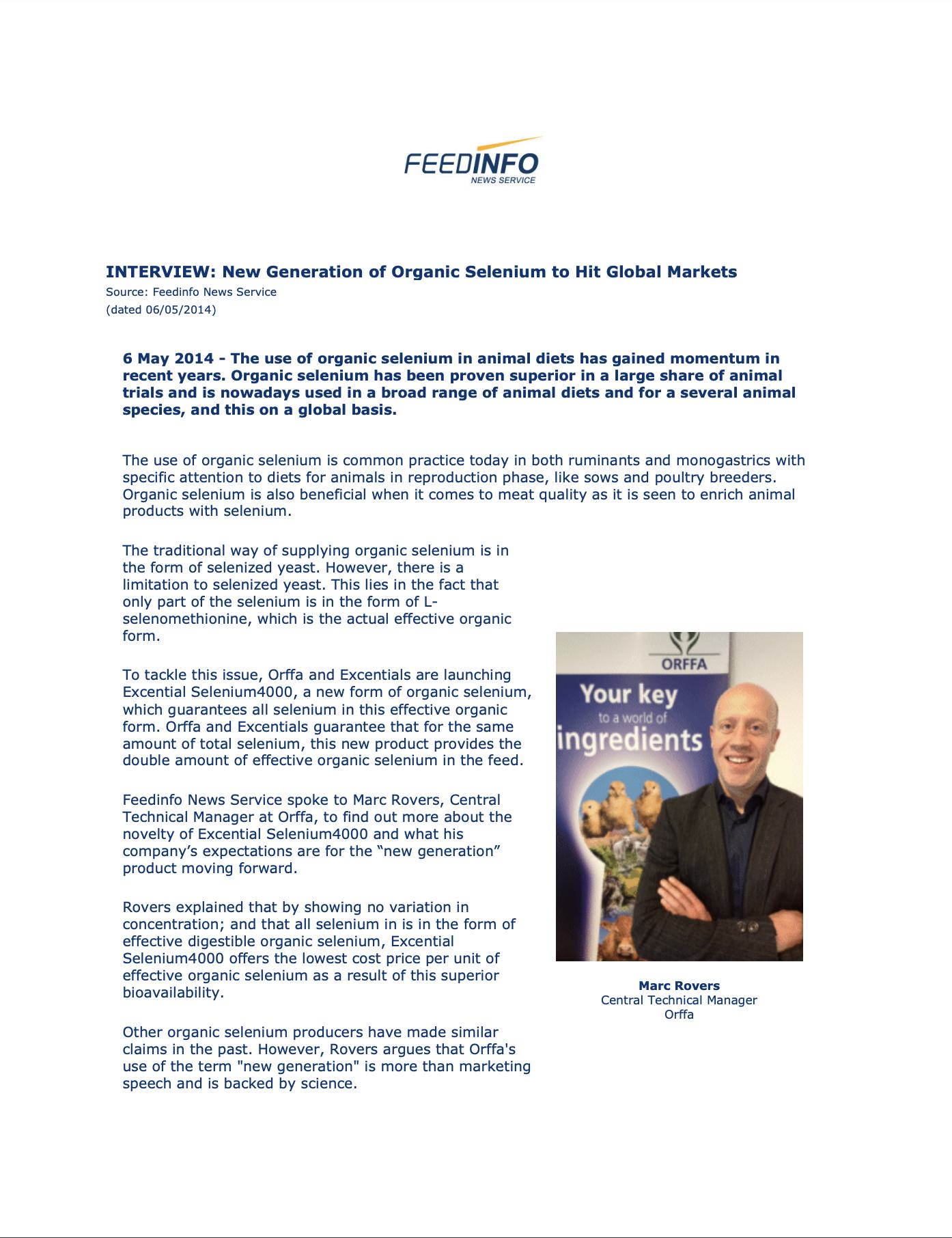 With the introduction of Excential Selenium4000 on the global market, Orffa is convinced that new possibilities will arise for animal nutritionists to provide organic selenium in an even more effective and cost efficient manner.17239826-48f3-451a-9339-7f1389a1d014, e110f00c-e8de-473c-9311-14c7516c6d0a,6a8415ac-c669-4253-a1a7-ba3d5d7872f1,96b0fedb-74b2-4bf5-87ea-3759b48f4217,0488eb96-b937-4f4b-af7d-6736cd38203f,c38f462e-3e5d-4b86-88f4-16cd48c1a5c0,726155a2-e68c-47a8-a221-7a7ff83773e5 11174f0e-2503-4011-83f9-3d4c7ff91e3d 677dbd38-0773-44d8-aa65-d2106819dd4e11174f0e-2503-4011-83f9-3d4c7ff91e3d201405012014 -