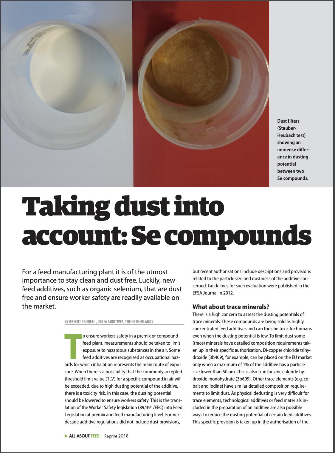For a feed manufacturing plant it is of the utmost importance to stay clean and dust free. Luckily, new feed additives, such as organic selenium, that are dust free and ensure worker safety are readily available on the market.17239826-48f3-451a-9339-7f1389a1d014, e110f00c-e8de-473c-9311-14c7516c6d0a,6a8415ac-c669-4253-a1a7-ba3d5d7872f1,96b0fedb-74b2-4bf5-87ea-3759b48f4217,0488eb96-b937-4f4b-af7d-6736cd38203f,c38f462e-3e5d-4b86-88f4-16cd48c1a5c0,726155a2-e68c-47a8-a221-7a7ff83773e5 11174f0e-2503-4011-83f9-3d4c7ff91e3d 677dbd38-0773-44d8-aa65-d2106819dd4e11174f0e-2503-4011-83f9-3d4c7ff91e3d201812012018 -