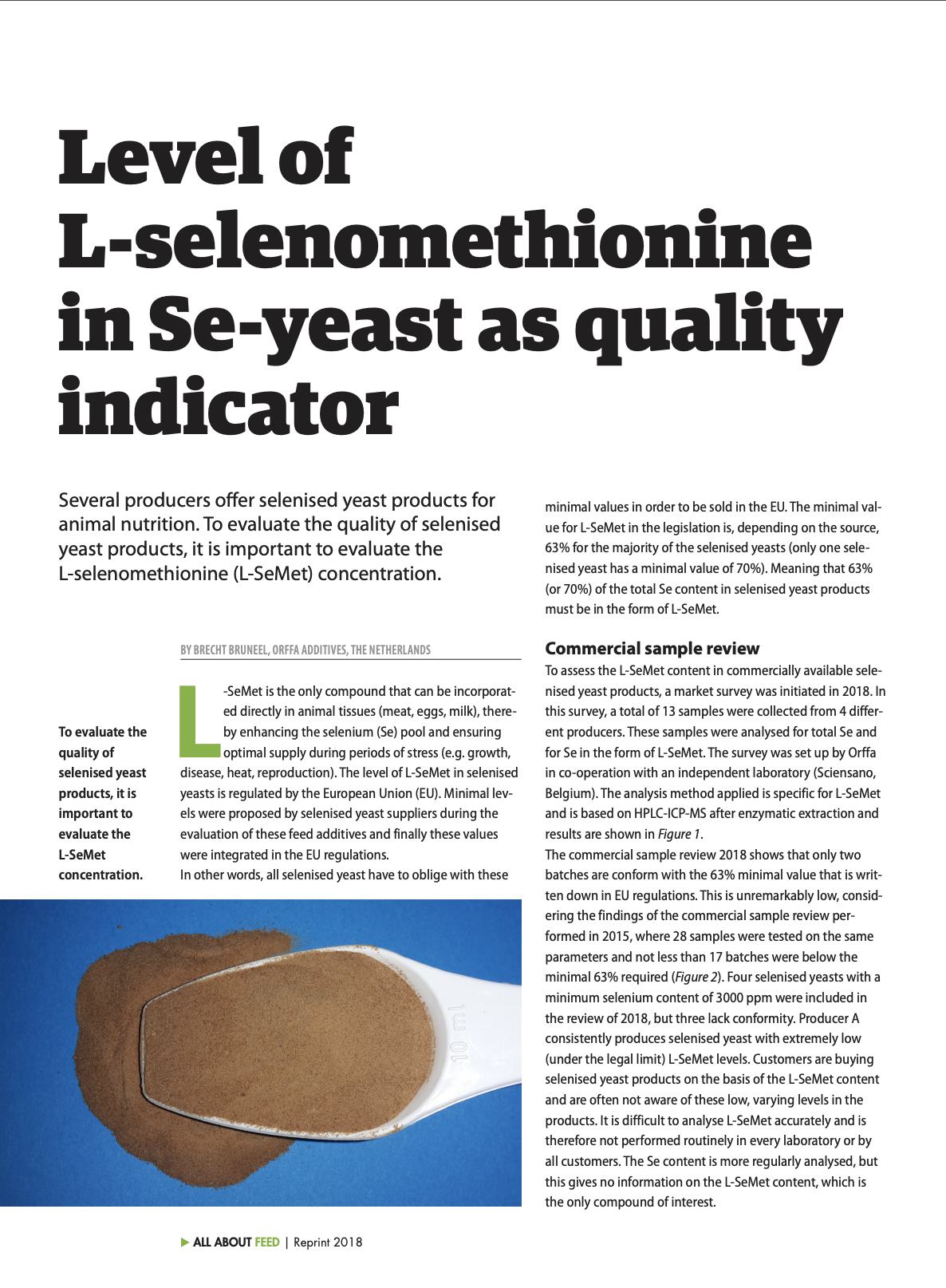 Several producers offer selenised yeast products for animal nutrition. To evaluate the quality of selenised yeast products, it is important to evaluate the L-selenomethionine (L-SeMet) concentration.17239826-48f3-451a-9339-7f1389a1d014, e110f00c-e8de-473c-9311-14c7516c6d0a,6a8415ac-c669-4253-a1a7-ba3d5d7872f1,96b0fedb-74b2-4bf5-87ea-3759b48f4217,0488eb96-b937-4f4b-af7d-6736cd38203f,c38f462e-3e5d-4b86-88f4-16cd48c1a5c0,726155a2-e68c-47a8-a221-7a7ff83773e5 11174f0e-2503-4011-83f9-3d4c7ff91e3d 677dbd38-0773-44d8-aa65-d2106819dd4e11174f0e-2503-4011-83f9-3d4c7ff91e3d201808012018 -