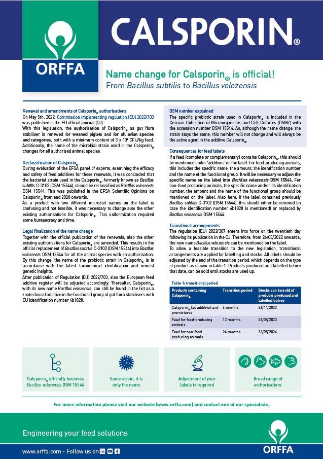 Renewal and amendments of Calsporin® authorisations On May 5th, 2022, Commission implementing regulation (EU) 2022/703 was published in the EU official journal (OJ).0e1d35c8-dda2-46c9-8fa1-b738e8fe1649, e110f00c-e8de-473c-9311-14c7516c6d0a,6a8415ac-c669-4253-a1a7-ba3d5d7872f1,96b0fedb-74b2-4bf5-87ea-3759b48f4217,0488eb96-b937-4f4b-af7d-6736cd38203f,c38f462e-3e5d-4b86-88f4-16cd48c1a5c0,726155a2-e68c-47a8-a221-7a7ff83773e5 6858c51e-bc53-4662-b2c9-1361d9a69159 677dbd38-0773-44d8-aa65-d2106819dd4e6858c51e-bc53-4662-b2c9-1361d9a69159202205262022 -