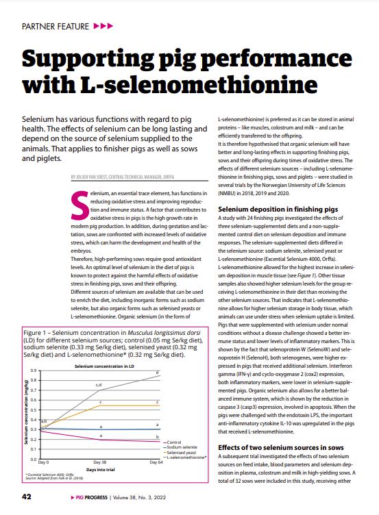 Selenium has various functions with regard to pig health. The effects of selenium can be long lasting and depend on the source of selenium supplied to the animals. That applies to finisher pigs as well as sows and piglets.17239826-48f3-451a-9339-7f1389a1d014, 6a8415ac-c669-4253-a1a7-ba3d5d7872f1 11174f0e-2503-4011-83f9-3d4c7ff91e3d 677dbd38-0773-44d8-aa65-d2106819dd4e11174f0e-2503-4011-83f9-3d4c7ff91e3d202205312022 -
