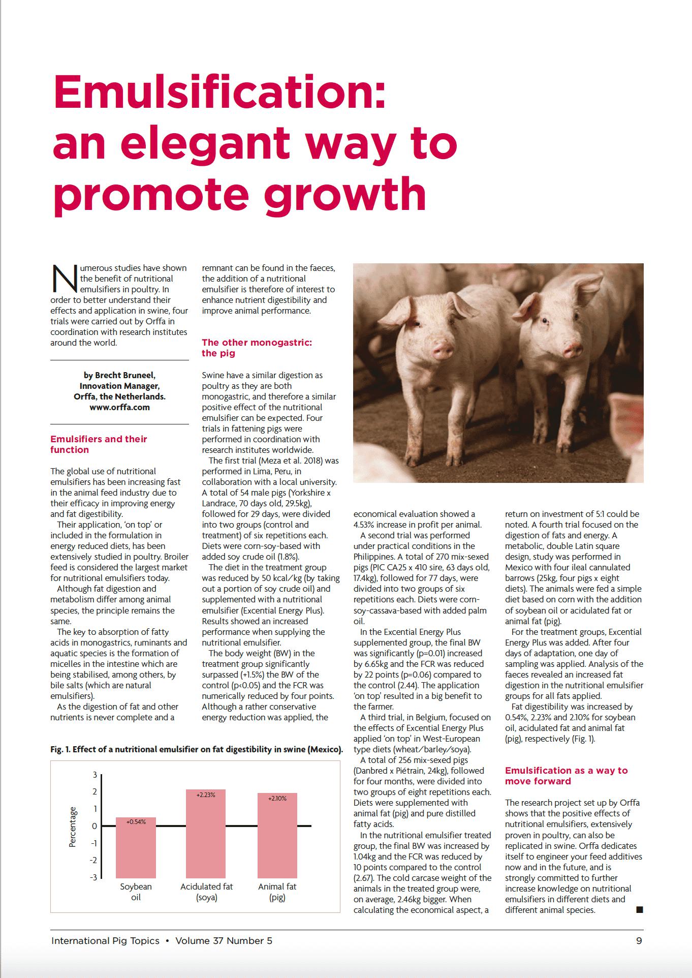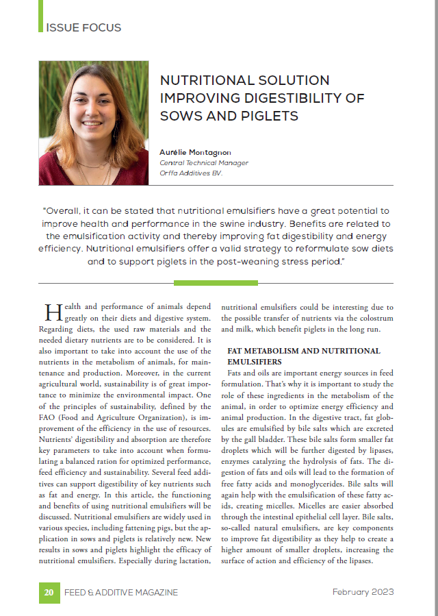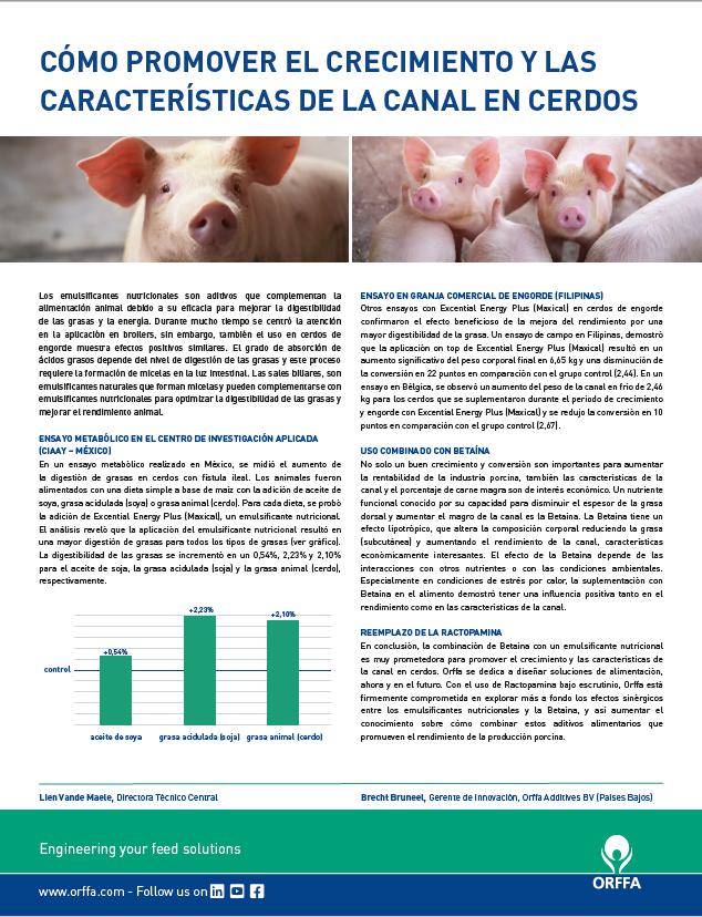 Numerous studies have shown the benefit of nutritional emulsifiers in poultry. In order to better understand their effects and application in swine, four trials were carried out by Orffa in coordination with research institutes around the world.75668571-875d-4f33-ae60-582bef77df3b, 6a8415ac-c669-4253-a1a7-ba3d5d7872f1 edb4ae6c-e790-4e64-9a55-f872c9e6281c 677dbd38-0773-44d8-aa65-d2106819dd4eedb4ae6c-e790-4e64-9a55-f872c9e6281c202110132021 -