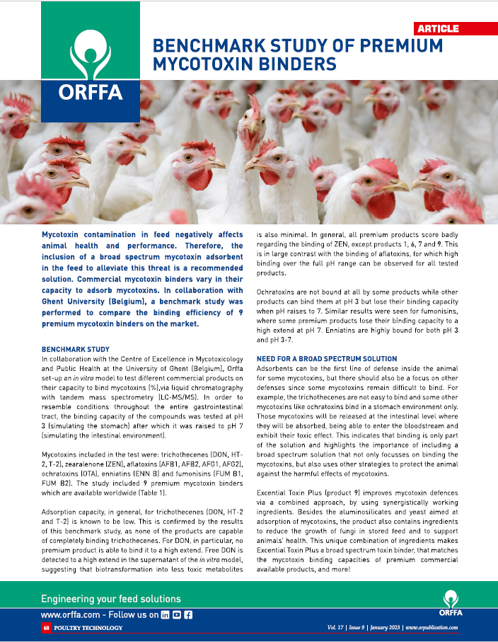 Mycotoxin contamination in feed negatively affects animal health and performance. Therefore, the inclusion of a broad spectrum mycotoxin adsorbent in the feed to alleviate this threat is a recommended solution.0e1d35c8-dda2-46c9-8fa1-b738e8fe1649, e110f00c-e8de-473c-9311-14c7516c6d0a,6a8415ac-c669-4253-a1a7-ba3d5d7872f1,96b0fedb-74b2-4bf5-87ea-3759b48f4217,0488eb96-b937-4f4b-af7d-6736cd38203f,c38f462e-3e5d-4b86-88f4-16cd48c1a5c0,726155a2-e68c-47a8-a221-7a7ff83773e5 9977cb92-e5fb-4009-a0d4-52ad667ee27c 677dbd38-0773-44d8-aa65-d2106819dd4e9977cb92-e5fb-4009-a0d4-52ad667ee27c202301052023 -