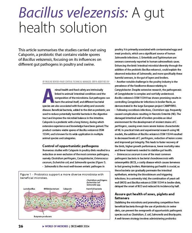 This article summarises the studies carried out using Calsporin, a probiotic that contains viable spores of Bacillus velezensis, focusing on its influences on different gut pathogens in poultry and swine.0e1d35c8-dda2-46c9-8fa1-b738e8fe1649, e110f00c-e8de-473c-9311-14c7516c6d0a,6a8415ac-c669-4253-a1a7-ba3d5d7872f1 6858c51e-bc53-4662-b2c9-1361d9a69159 677dbd38-0773-44d8-aa65-d2106819dd4e6858c51e-bc53-4662-b2c9-1361d9a69159202412202024 -