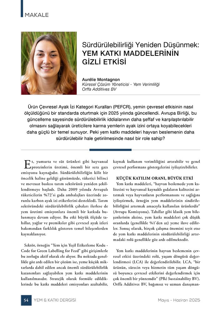 Ürün Çevresel Ayak İzi Kategori Kuralları (PEFCR), yemin çevresel etkisinin nasıl ölçüldüğünü bir standarda oturtmak için 2025 yılında güncellendi. Avrupa Birliği, bu güncelleme sayesinde sürdürülebilirlik iddialarının daha şeffaf ve karşılaştırılabilir olmasını sağlayarak üreticilere karma yemlerin ayak izini ortaya koyabilecekleri daha güçlü bir temel sunuyor. Peki yem katkı maddeleri hayvan beslemenin daha sürdürülebilir hale getirilmesinde nasıl bir role sahip?75668571-875d-4f33-ae60-582bef77df3b, e110f00c-e8de-473c-9311-14c7516c6d0a,6a8415ac-c669-4253-a1a7-ba3d5d7872f1,96b0fedb-74b2-4bf5-87ea-3759b48f4217,0488eb96-b937-4f4b-af7d-6736cd38203f,c38f462e-3e5d-4b86-88f4-16cd48c1a5c0,726155a2-e68c-47a8-a221-7a7ff83773e5 b1593db0-31fe-429f-8cd8-ac5a04ed6642,edb4ae6c-e790-4e64-9a55-f872c9e6281c 746d203e-ed75-4cca-81d3-855cee564df4b1593db0-31fe-429f-8cd8-ac5a04ed6642,edb4ae6c-e790-4e64-9a55-f872c9e6281c202505272025 -